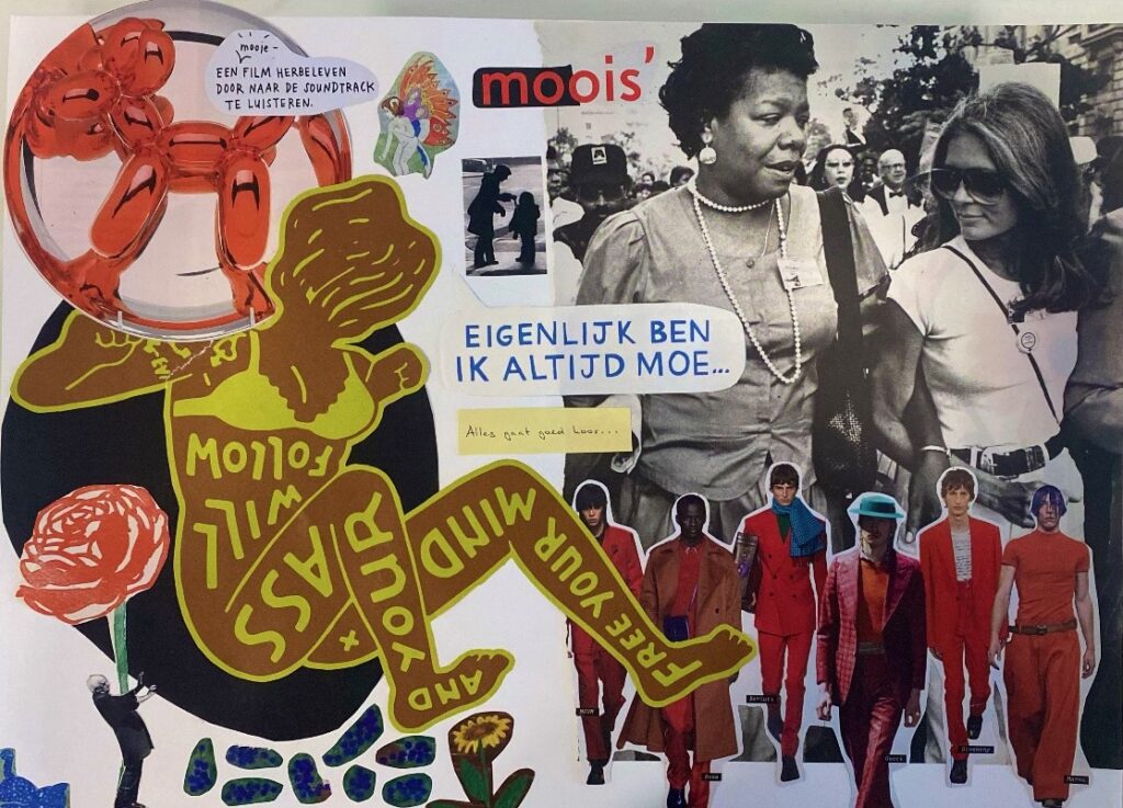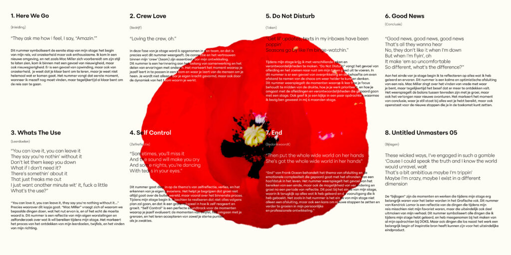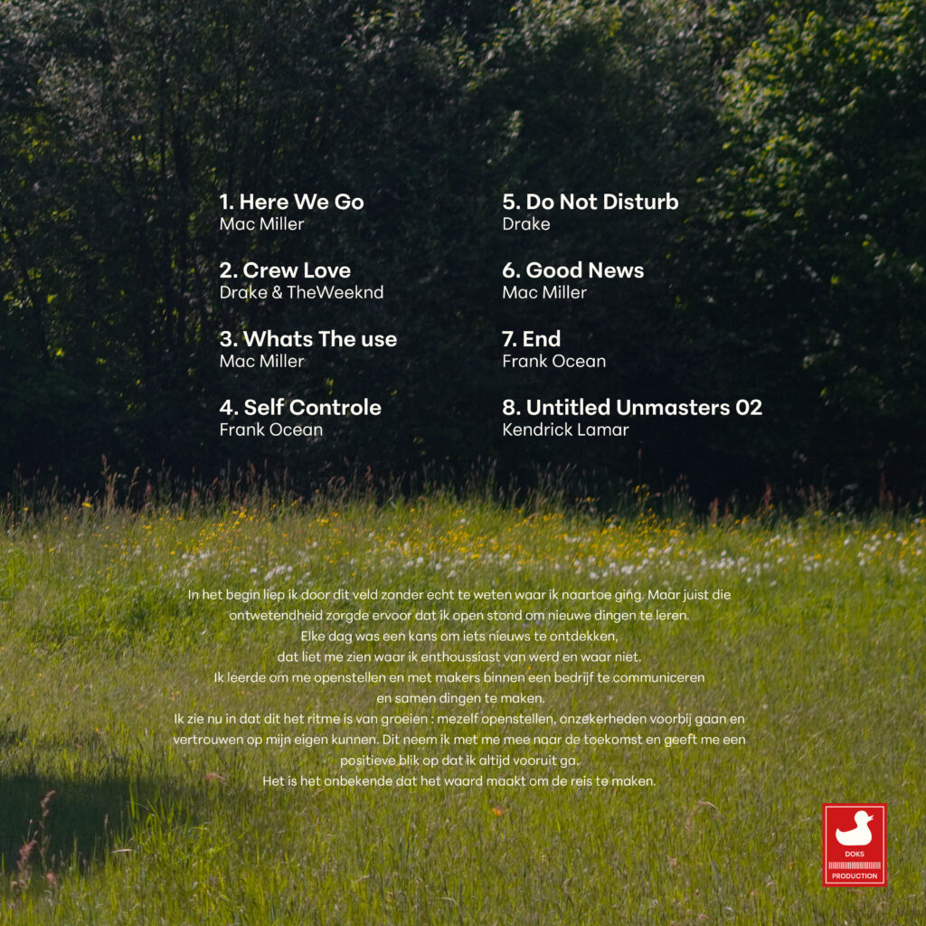 Voor elke stap in mijn stageproces heb ik een nummer gekozen dat ik zelf graag luister en waarvan de lyrics passen bij dat moment. Op de binnenkant van de hoes staan kleine stukjes van deze teksten, met een korte uitleg waarom het nummer bij die fase past.